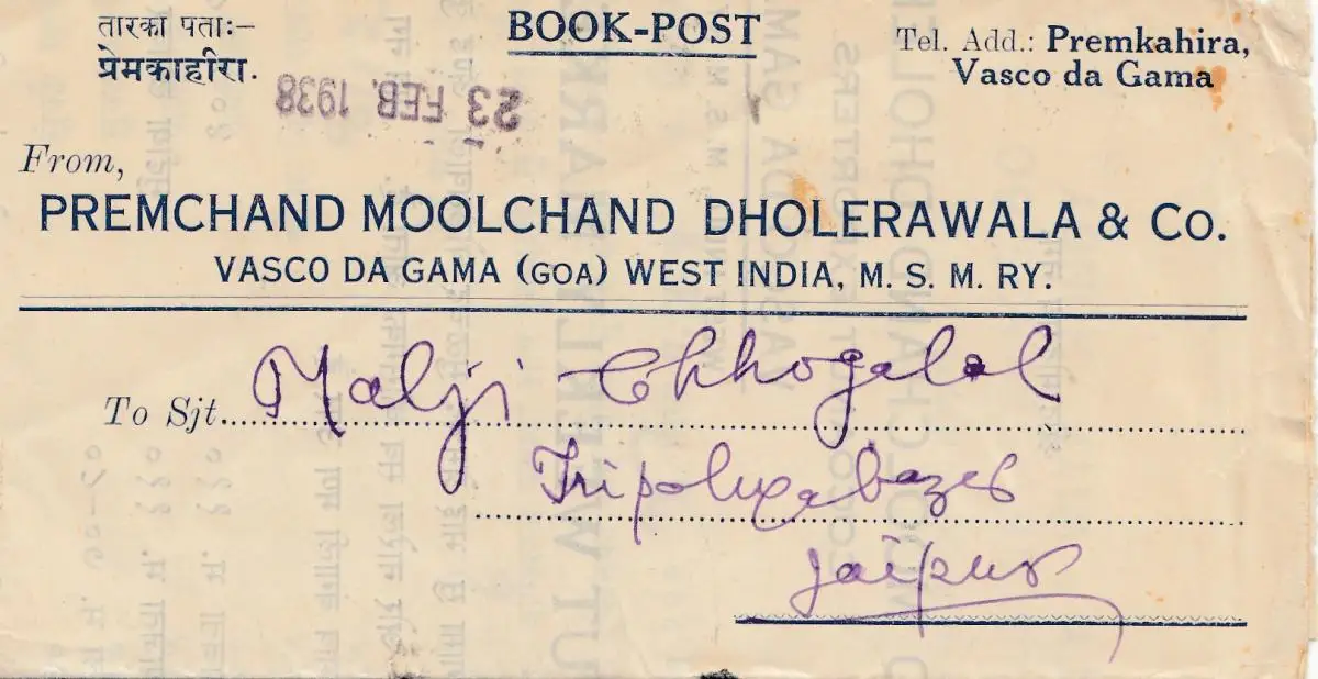 West India: 1938: Book Post Goa to Jaipur via Bombay, ship