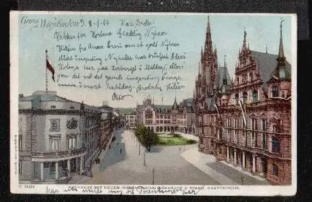 Wiesbaden. Rathaus mit neuem Mädchenschulgebäude und evang. Hauptkirche - Gebraucht. 1904. Briefmarke abgerissen. (NPLZ 65000)