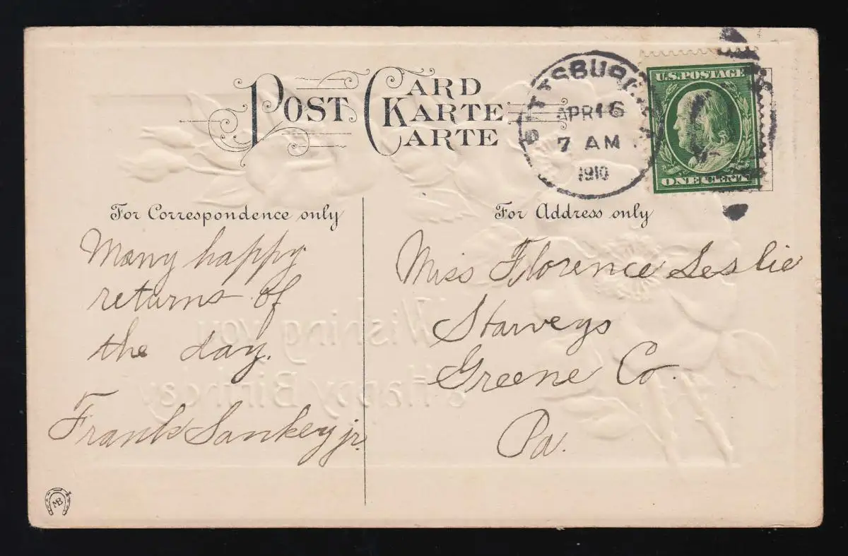 Wishing you a Joyeux anniversaire, Branches roses blanches, Pittsburgh 16.4.1910