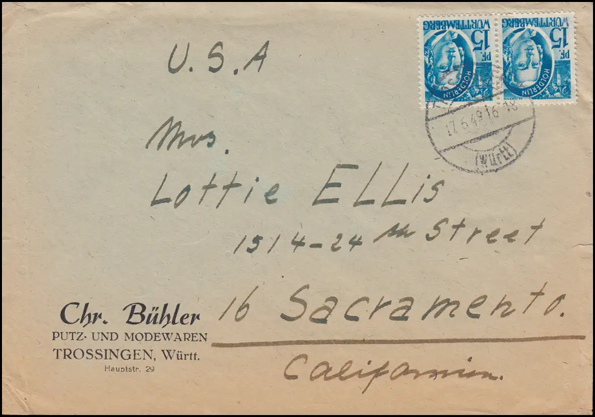 porto-francolat multiple sur lettre internationale de la société Putz- und Modewaren Bühler in Trossingen vers Sacramento USA N° de catalogue: 19 Examen: original Référence produit: 00000000035400>Note: Cet article n'est disponible qu'une seule fois. Vous recevrez exactement l'article représenté.