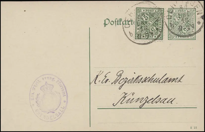 Carte postale de service avec impression 2 12, Evangelisches Pfarräftung Orendelsall / Evgelischer Stadtschulrat Orendelsall à l'Ecole de district de Künzelsau N° de catalogue: DP43Ib/02 Examen: original Numéro d'article: 00000000007174
