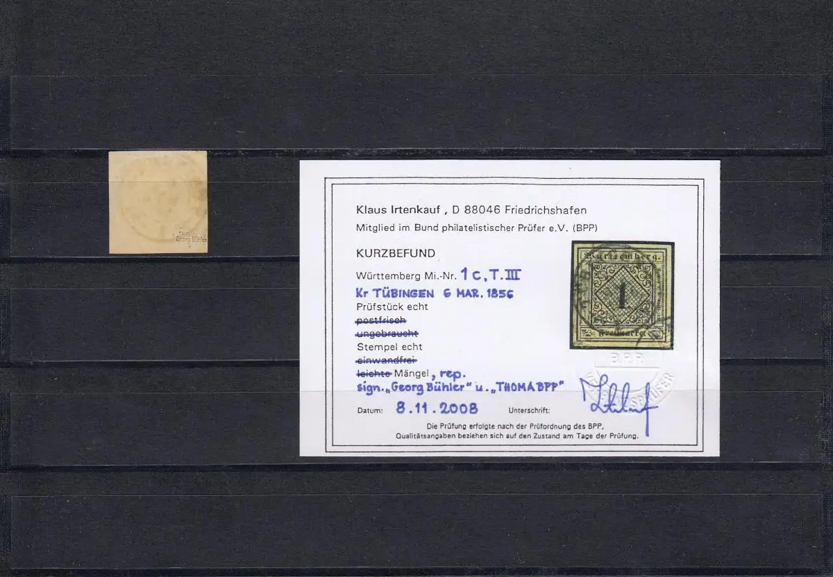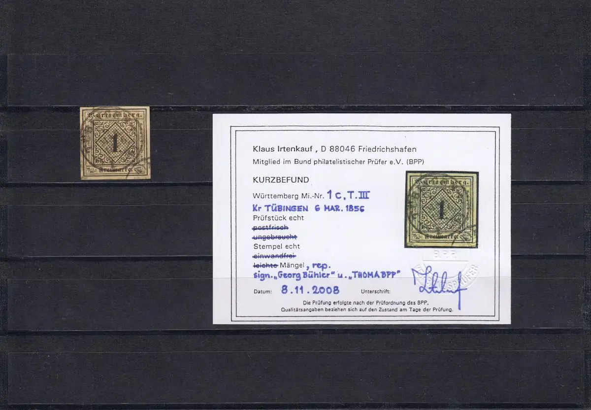 Wurtemberg: Min° 1c T. III, cacheté Tübingen, BPP résultat
