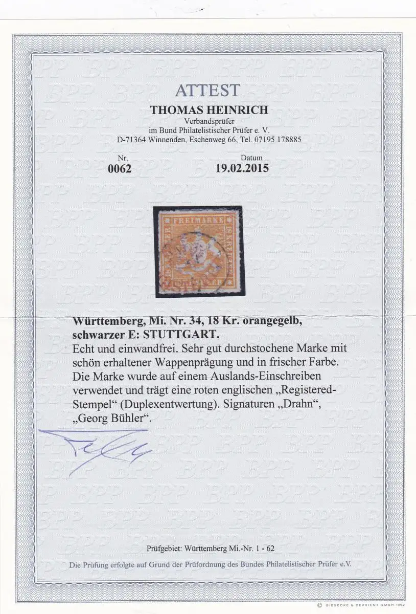 Wurtemberg: Min. 34, cacheté Stuttgart, BPP Attest