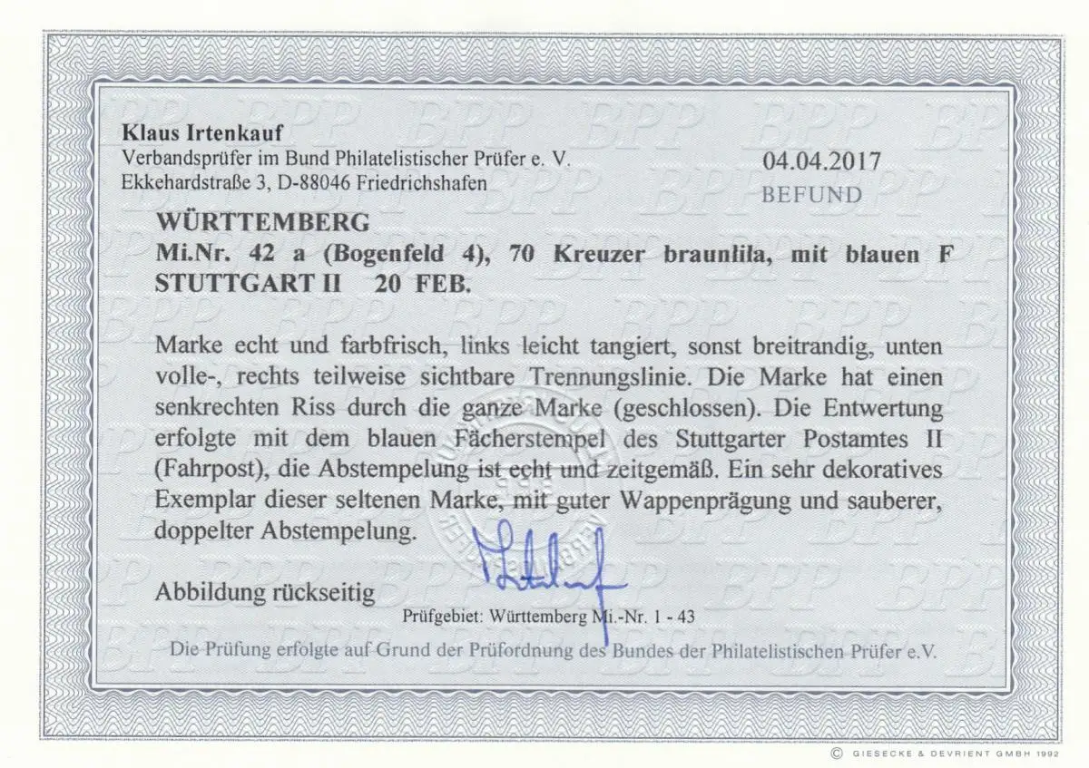 Wurtemberg: Min° 42 a, Arcefeld 4, cacheté, BPP résultats, défauts