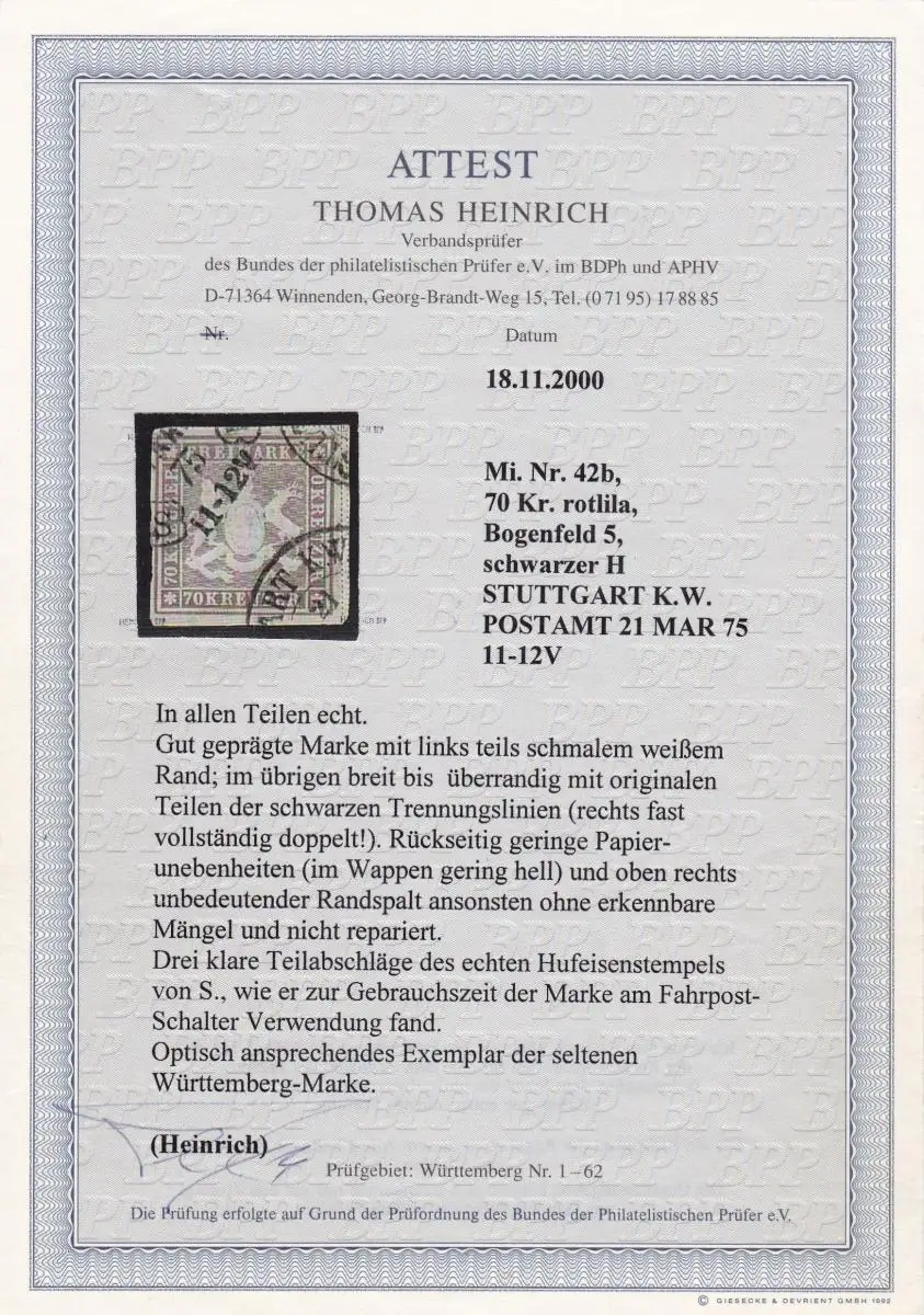 Wurtemberg Min. 42b, cacheté Stuttgart, BPP Attest