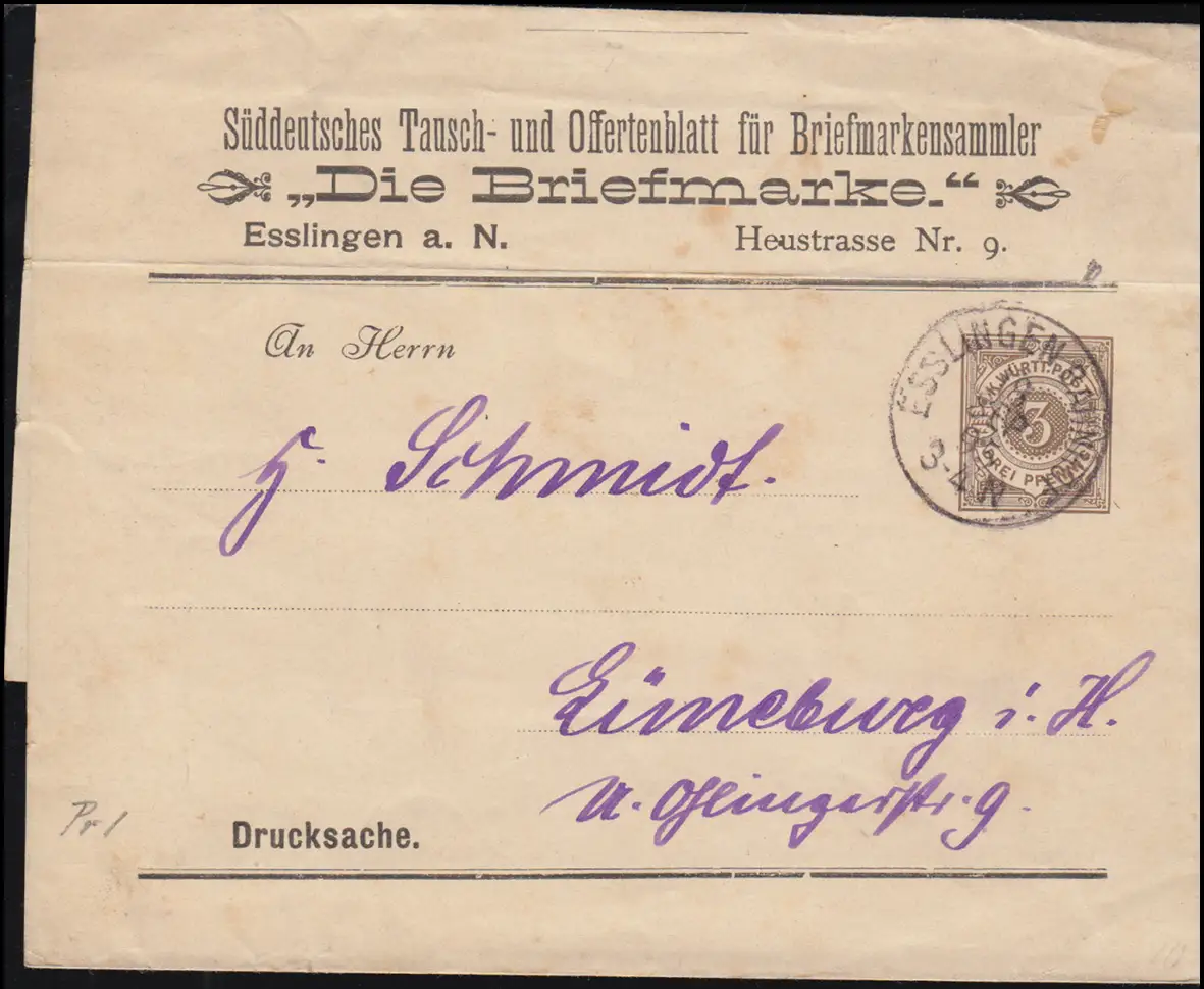 Württemberg PS 2 chiffre 3 pf marron Objet imprimé Le timbre ESSLINGEN 8.9.1895
