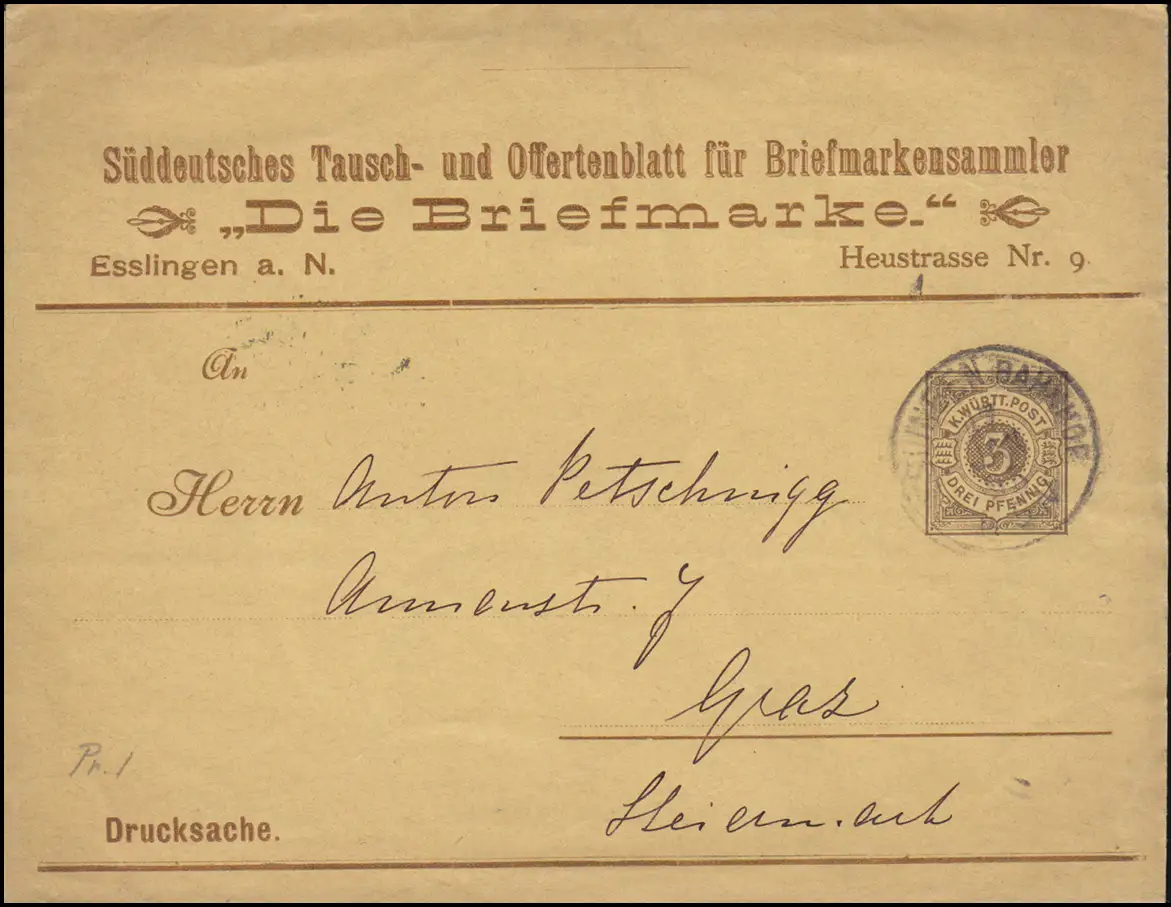 Württemberg PS 2 chiffre Objet imprimé Le timbre ESSLINGEN-BAHNHOF 17.1.1895