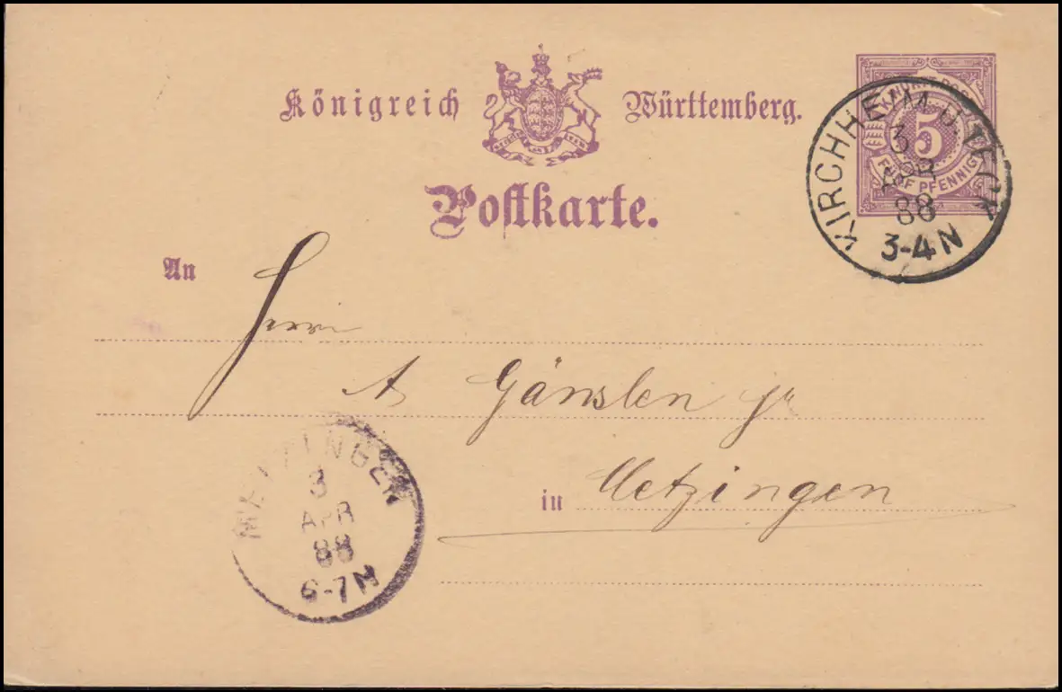 Wurtemberg Carte postale P 26, KIRCHHEIM sous TECK 3.4.1888 après METZINGEN 3.4.8