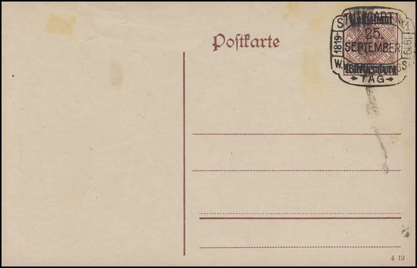 Carte postale de service avec impression noire Volksstaat Wurtemberg et avec mention sur papier 4 19, carte blanche avec cachet spécial, légèrement tachetée Numéro de catalogue: DP16 Examen: original Référence produit: 00000000007771>p>Remarque: Cet article n'est disponible qu'une seule fois. Vous recevrez exactement l'article illustré.