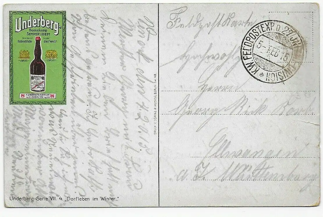 Wurtemberg Feldpost 1915, Underberg Carte publicitaire: Village vie en hiver