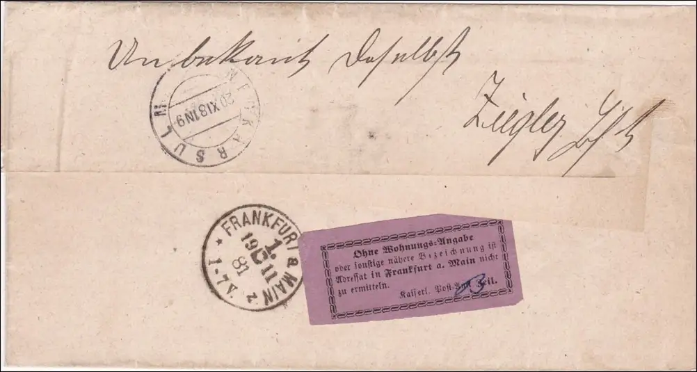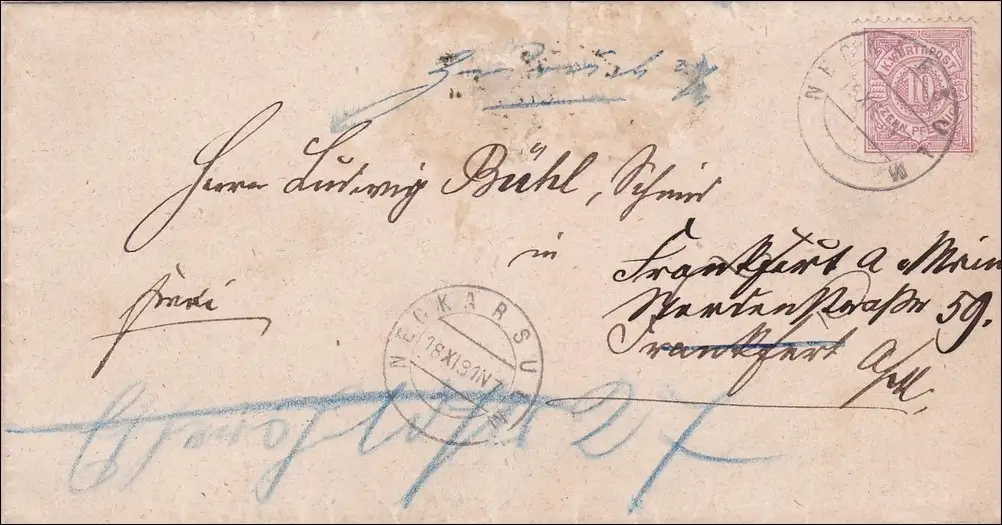 Wurtemberg: Lettre Neckarsulm et retour 1891, note postale: