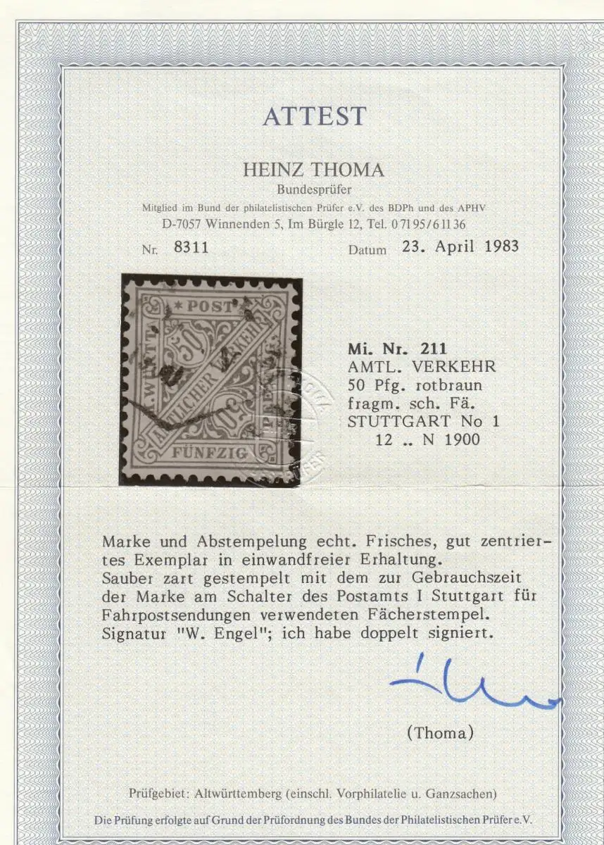 Wurtemberg: Min. 211, cacheté, BPP Attest