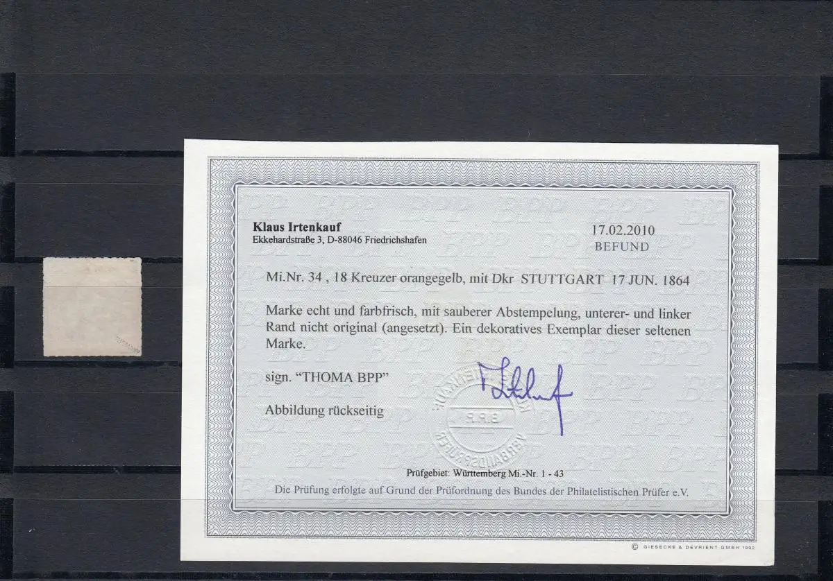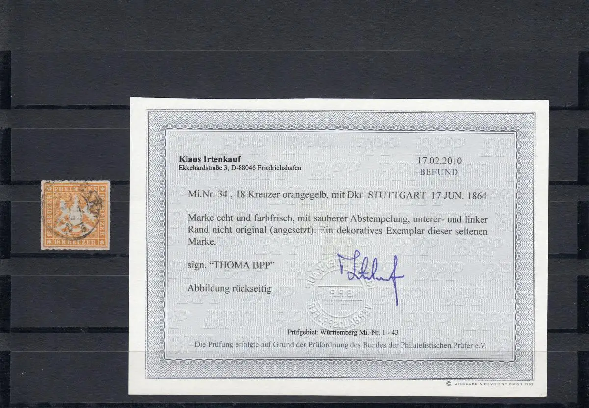 Wurtemberg Min. 34, cacheté Stuttgart, BPP résultat