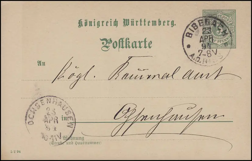 Wurtemberg P 37 paragraphe 5 Pf DV 5 2 94, BIBERACH 23.4.94 vers OCHSENHAUSEN 23.04.94