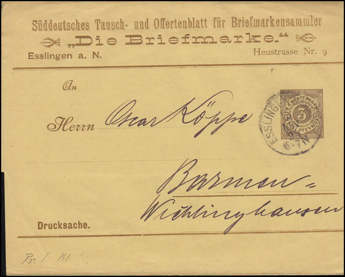 Wurtemberg PS 2 Streifband Le timbre ESSLINGEN-BAHNHOF 14.11.1894