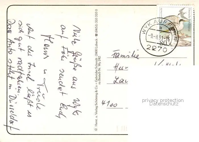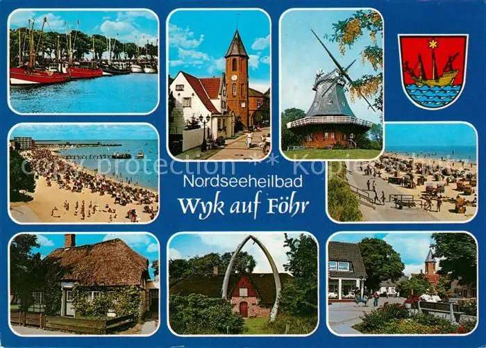 Wyk_Foehr Strand Hafen Windmuehle Kirche Reetdachhaus Foehr postalisch gelaufen 1991 Erhaltung siehe scans [KathaD81] Kathoren
