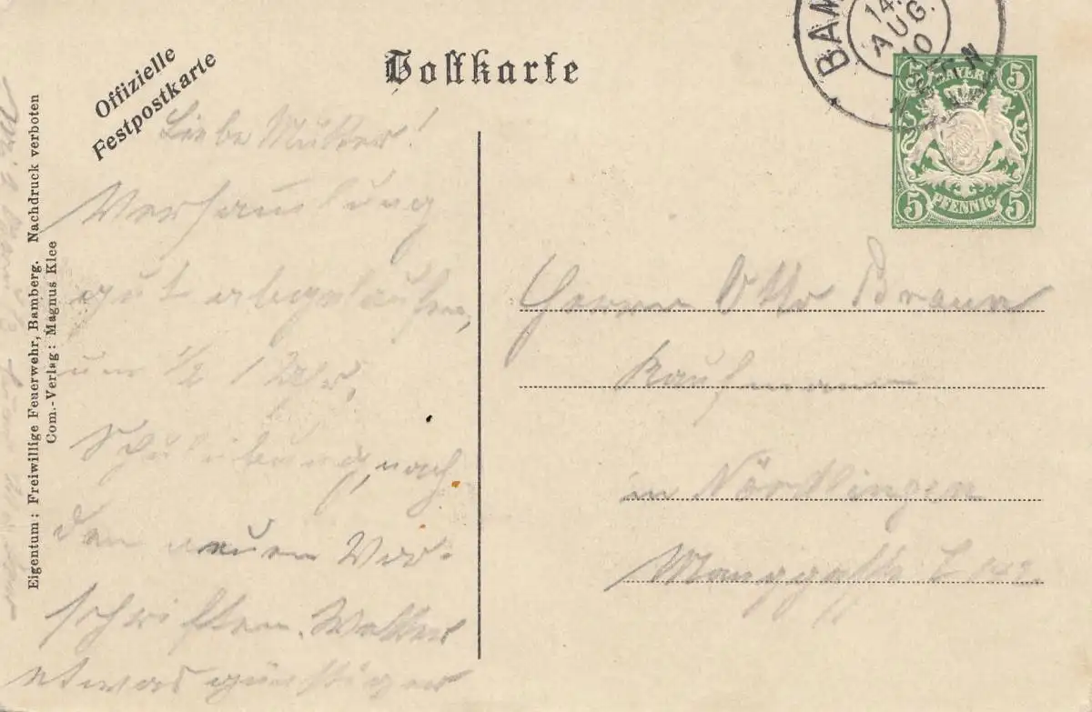 XI Journée Bayrie des pompiers Bamber 1910, carte de vue