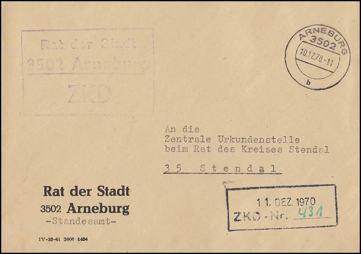 Tampon d'entrée au Conseil du Cercle Stendal / Bureau d ' acte le 11.12.1970 avec numéro ZKD 431 Examen: original Numéro d ’ article: 00000000025801