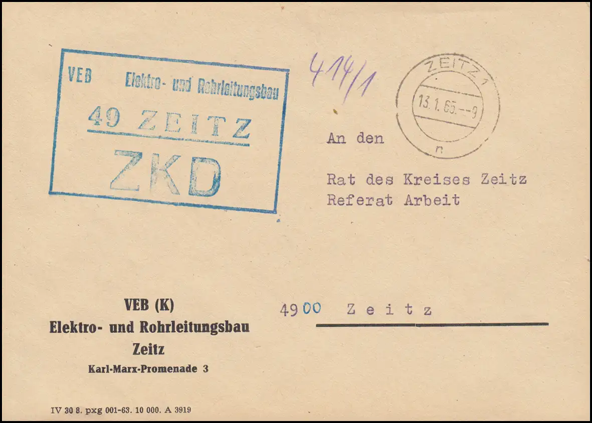 Lettre ZKD VEB Construction électrique et de tuyauterie Zeitz comme lettre locale 13.1.65