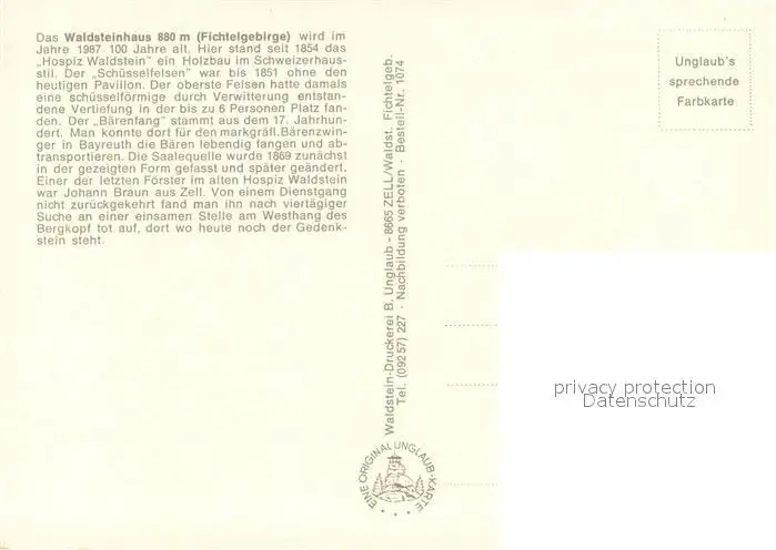 Zell_Fichtelgebirge 100 Jahre Waldsteinhaus Fichtelgebirge Hospiz Waldstein Saalequelle Foerster Braun Gedenkstein Schuesselfelsen um 1850 Baerenfang 17. Jhdt. Zell Fichtelgebirge postalisch nicht gelaufen nach 1965 Erhaltung siehe scans [FriedD77] Frierer