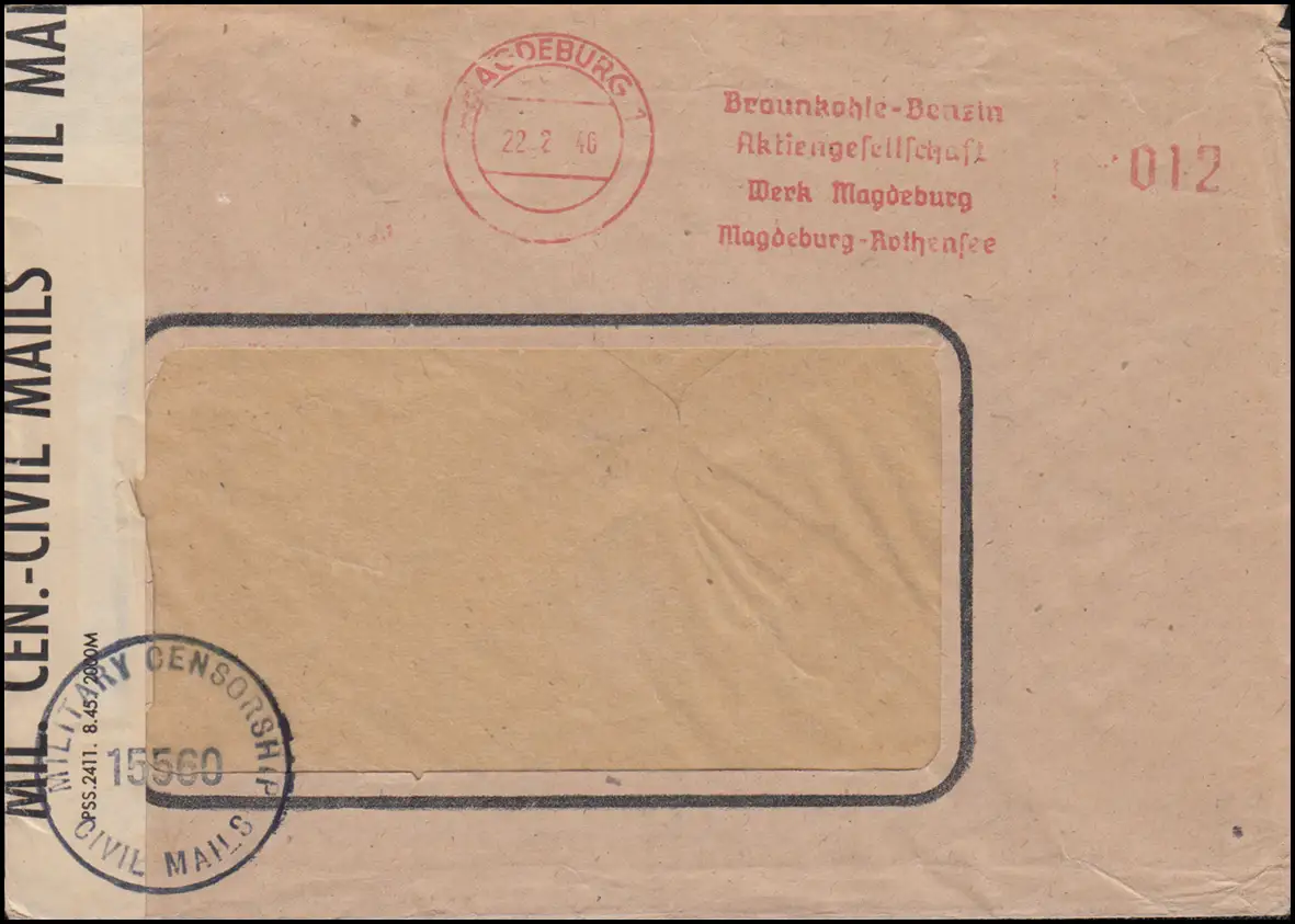 Censure Military Censorship 15560 Lettre AFS MAGDEBURG Lignite-Benzine 22.2.46