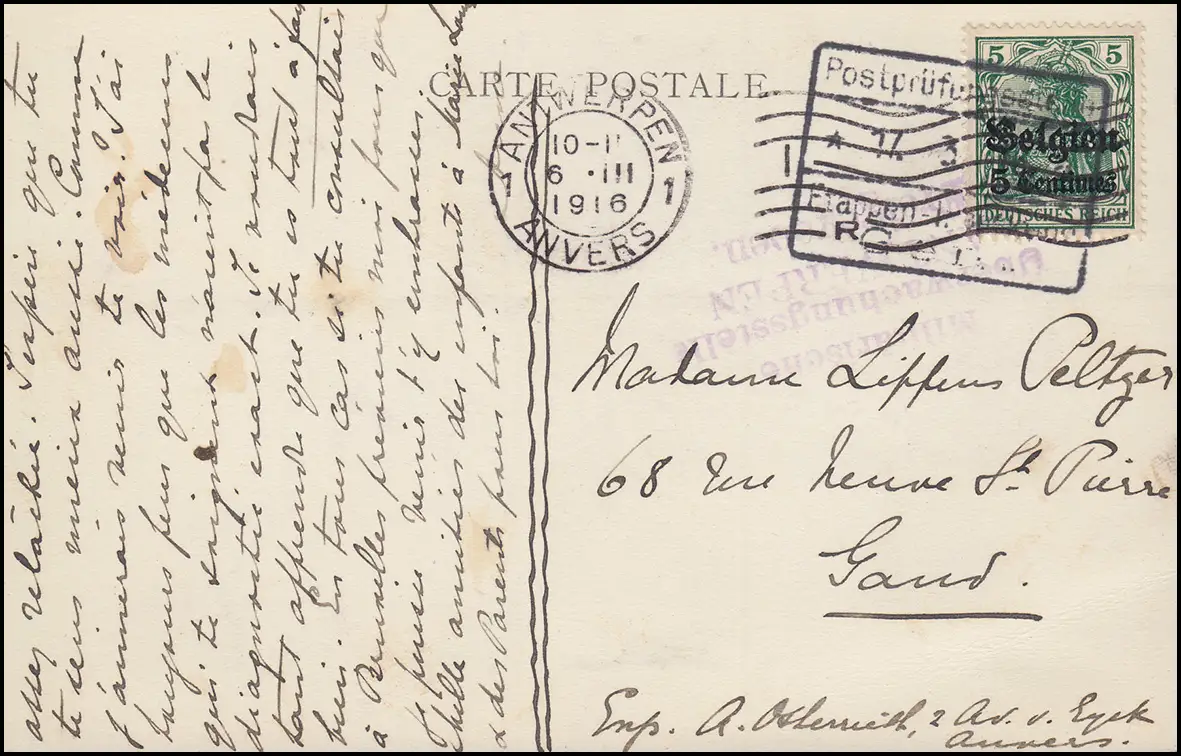 et avec cachet de censure "Point de surveillance militaire d'Anvers Parmis," Temple quotidien d ANTWERPEN 6.3.16 Vérification: original Référence produit: 00000000028071>Note: Cet article n'est disponible qu'une seule fois. Vous recevrez exactement l'article représenté.
