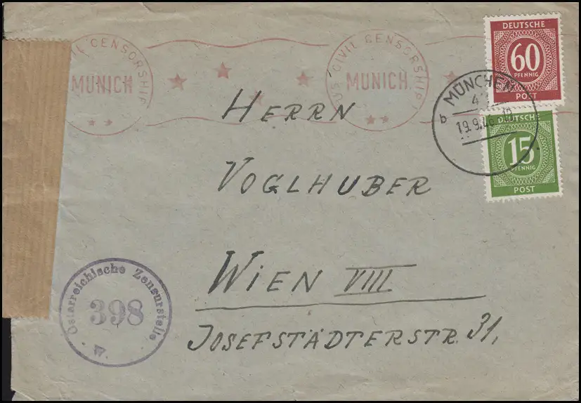 Cennorship US CIVIL CENSORSHIP MUNCH sur lettre MiF apôt MUNICH 19.9.46 à Vienne