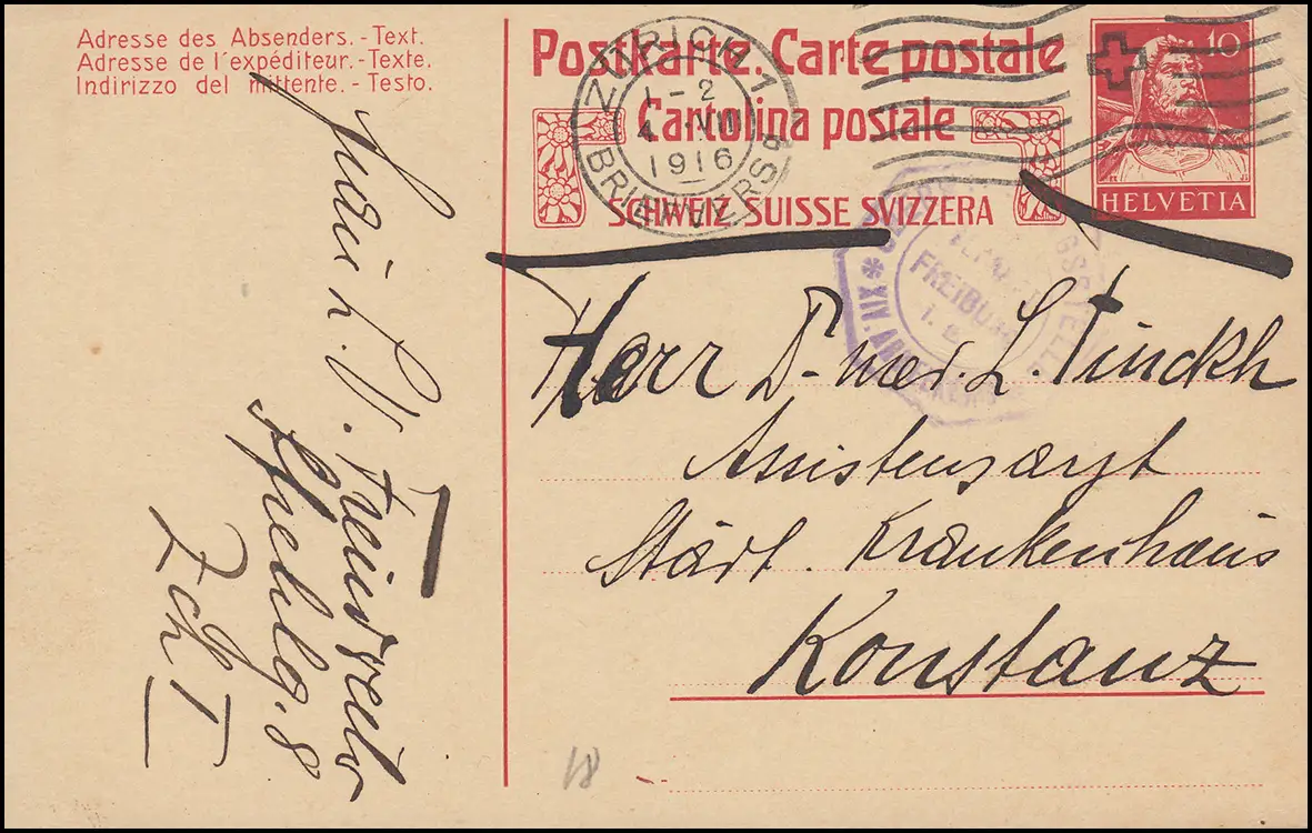 Censuration en Suisse Carte postale P 74a Tellbrustbild ZÜRICH 4.8.1916 selon Constance