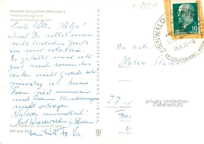 Zinnwald-Georgenfeld FDGB Erholungsheim Zentrale Verpflegungsstelle Zinnwald-Georgenfeld postalisch gelaufen 1973 Erhaltung siehe scans [FriedD77] Frierer