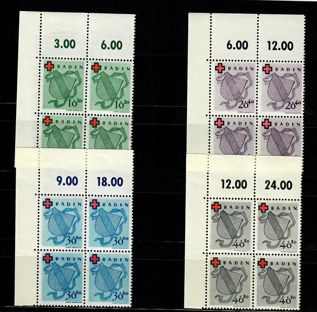 Zone Baden: Mi Nr. 43-45A, Eckrand Quaderblock VE1, post-freisch, **