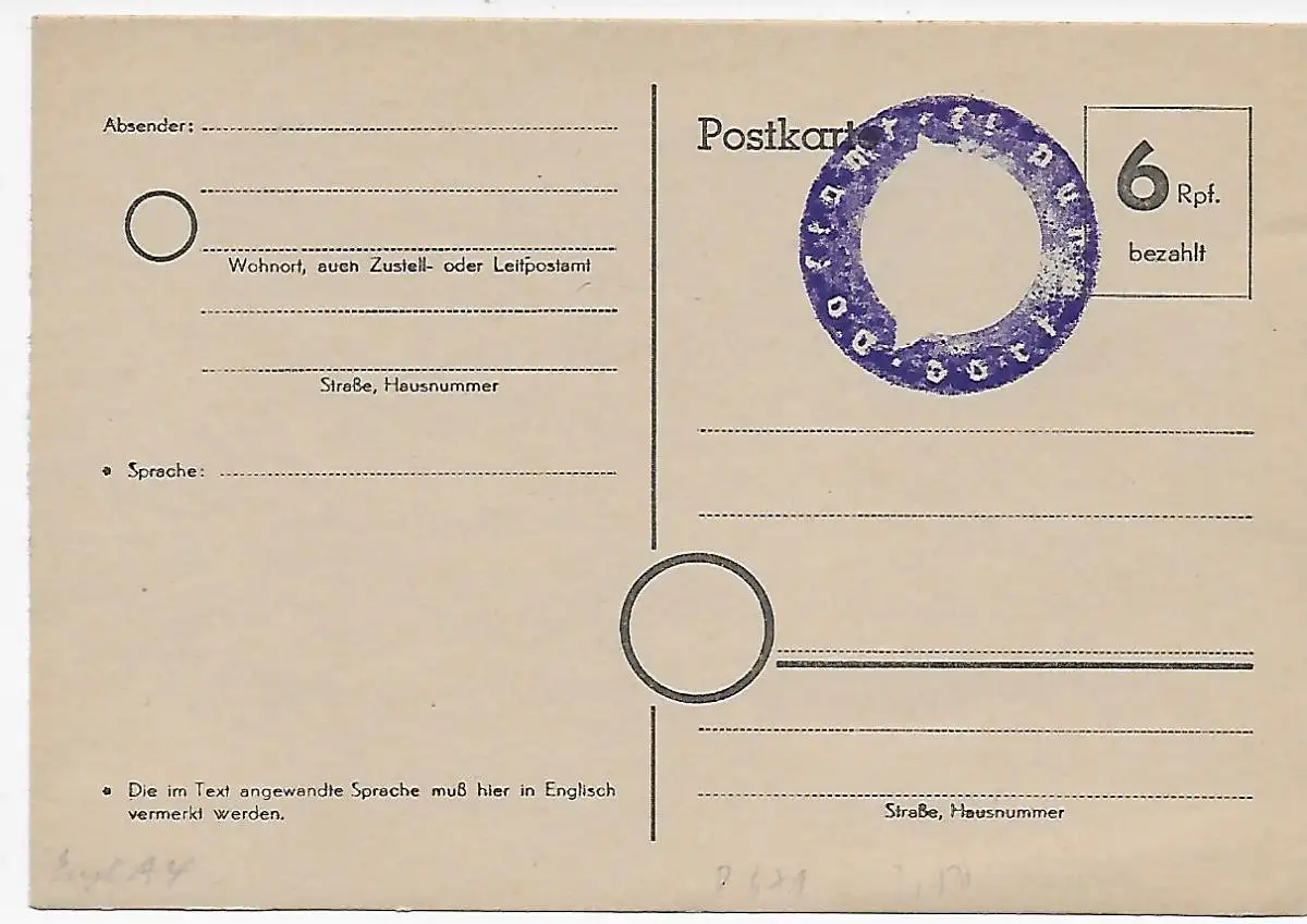 Zone britannique: carte postale P671, 6 Rpf. payée, cachet négatif