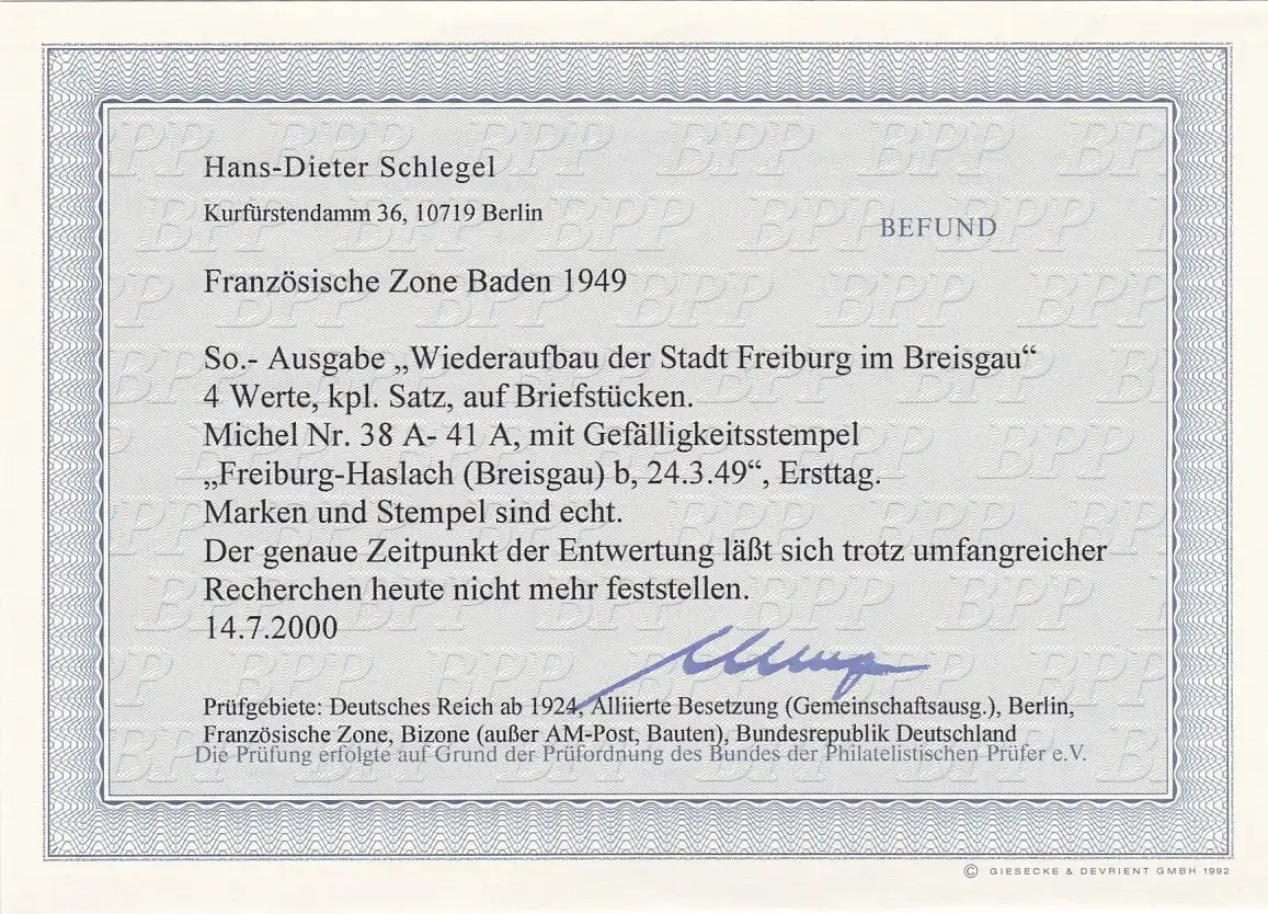 Zone française: MiN° 38A - 41A, cachet de Fribourg Haslach 1949, BPP résultat