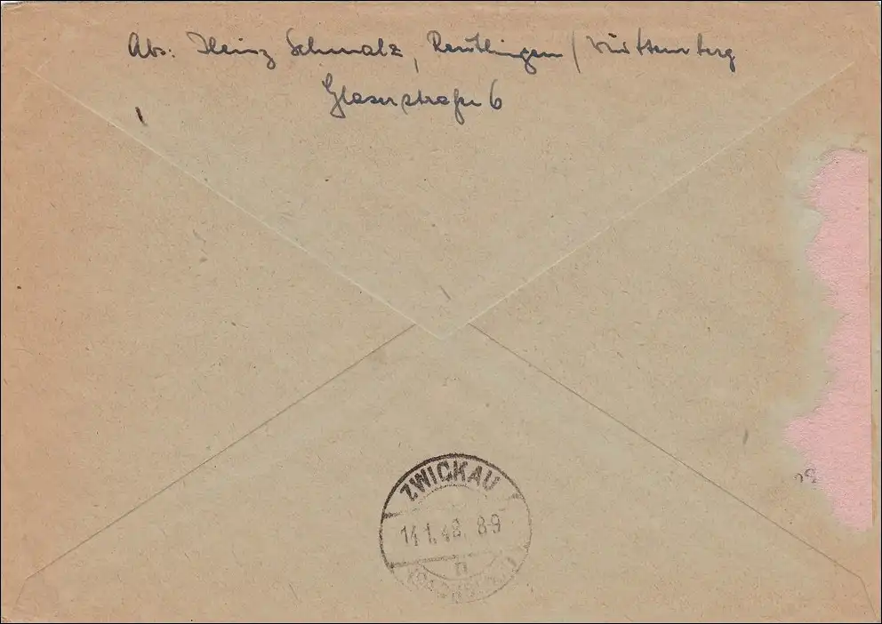 Zone française: recommandé de Reutlingen vers Zwickau 1947