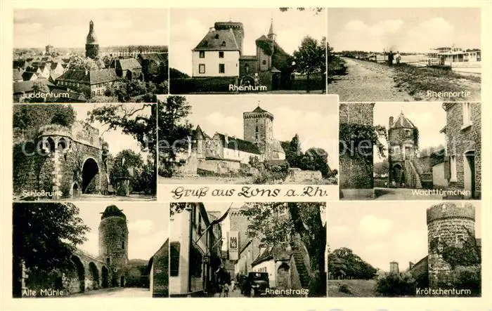 Zons Judenturm Rheinturm Rheinpartie Schlossruine Wachttuermchen Alte Muehle Rheinstrasse Kroetschenturm Zons postalisch nicht gelaufen 1921-1965 Erhaltung siehe scans [WerneD78] WernPID7