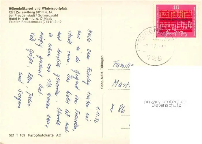 Zwieselberg_Freudenstadt Hotel Hirsch Hoehenluftkurort Wintersportplatz im Schwarzwald Zwieselberg_Freudenstadt postalisch gelaufen 1972 Erhaltung siehe scans [FriedD77] Frierer
