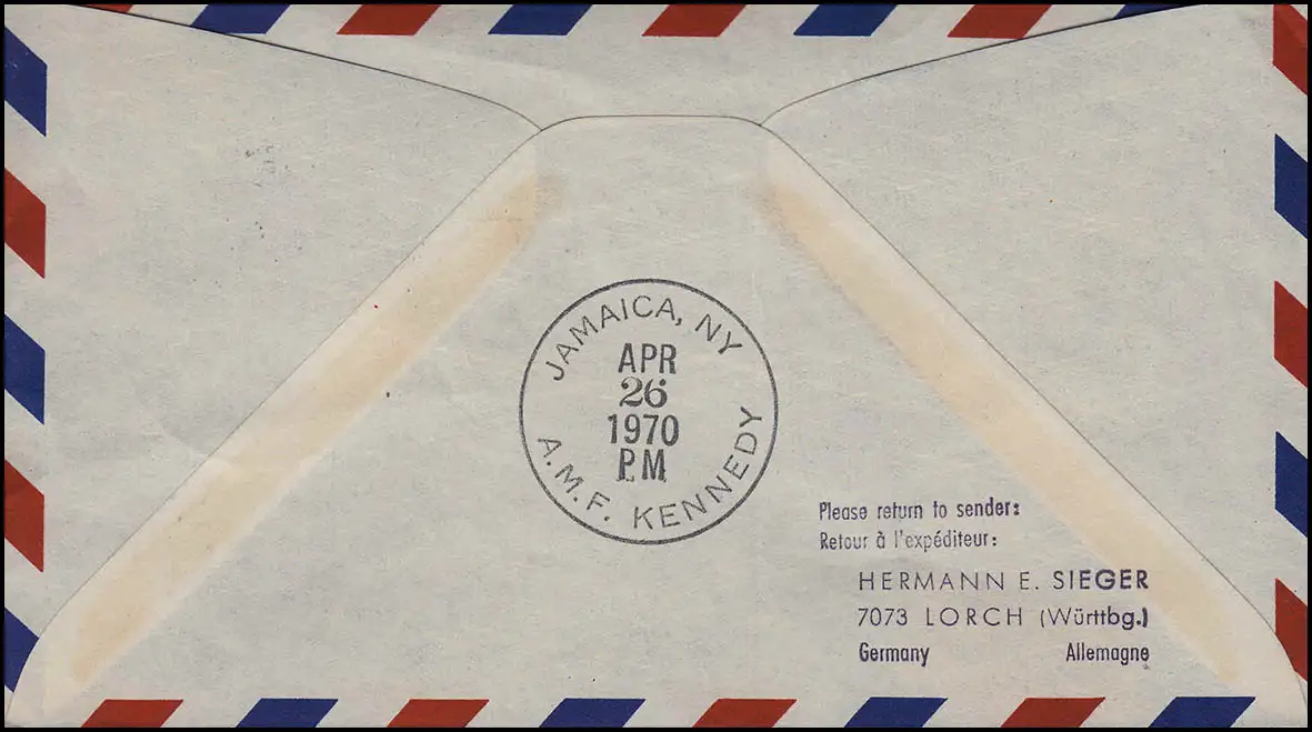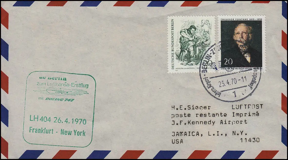 à partir de Berlin pour le vol LH 404: Francfort - New York 26.4.1970, lettre SSt BERLIN