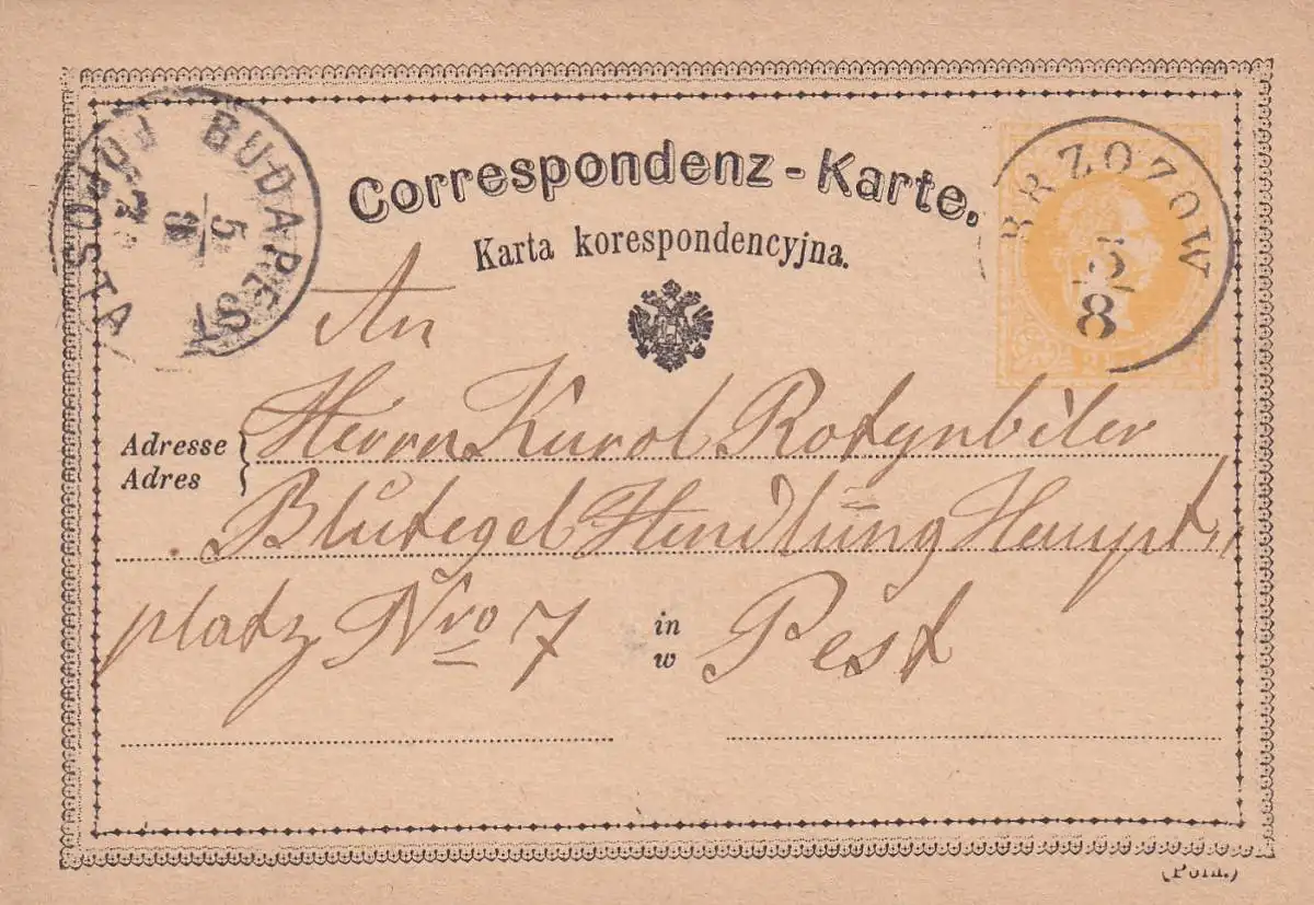 Post card Brozow 187? to Hungary - Pest/Budapest