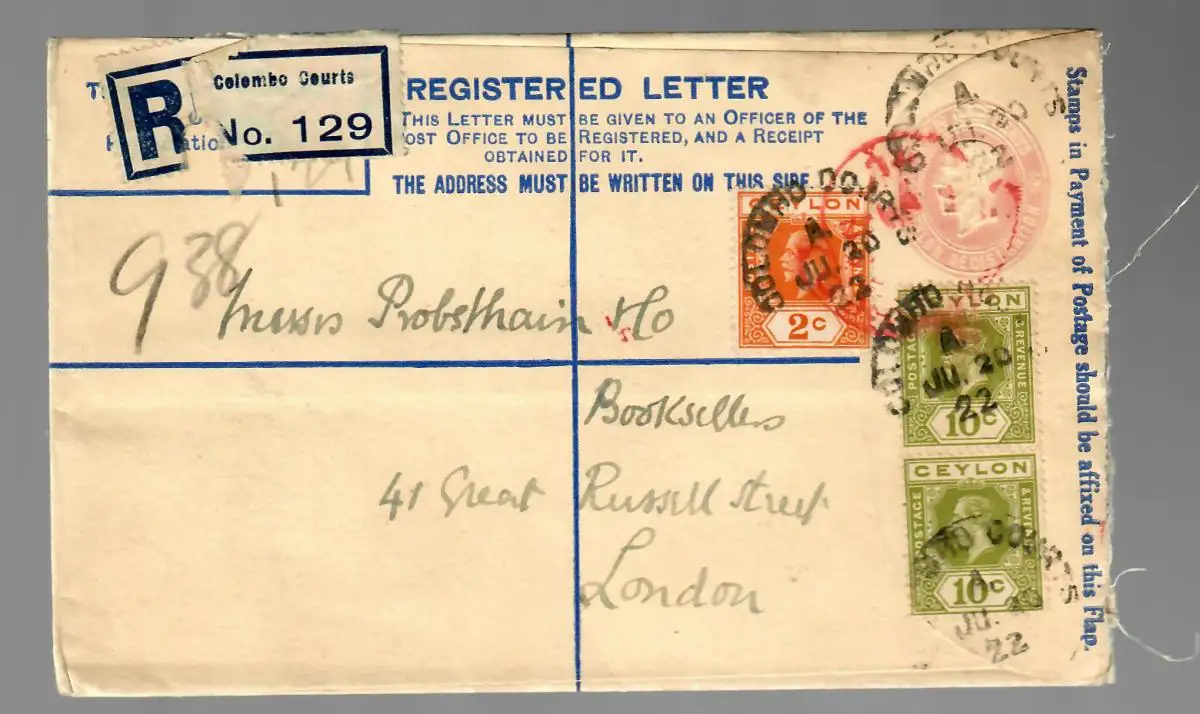 registered letter Colombo Courts to London 1922