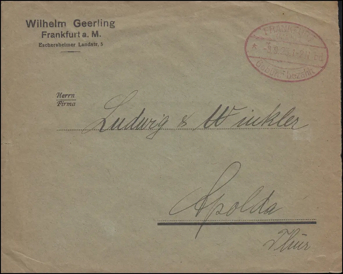 Temple ovale rouge frais-payé FRANKFURT/MAIN 8.9.1923 sur lettre à Apolda