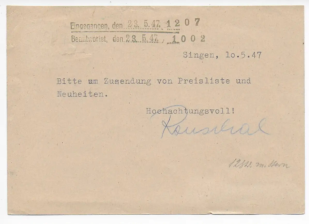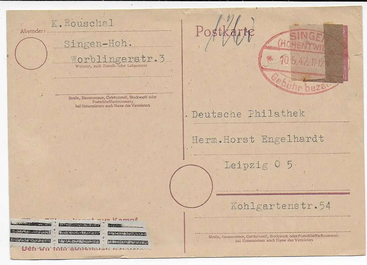 Carte postale surcollée de Singen-Hautwiel vers Leipzig 1947