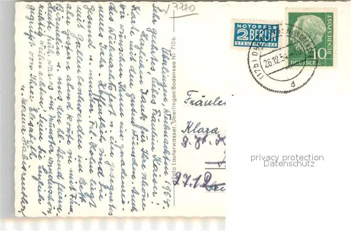 ueberlingen_Bodensee Hofstatt Brunnen Christbaum Muenster Nachtaufnahme Neujahrskarte ueberlingen Bodensee postalisch gelaufen 1954 Erhaltung siehe scans [FriedD77] Frierer