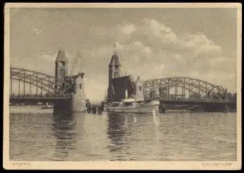 x13542; Stettin. Baumbrücke. - Gelaufen 1934. Knick. Kl. Riss. (Polen, Pommern)