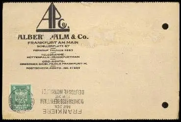 x13967; Frankfurt. Albert Palm u. Co. - Gelaufen 1924. 2xLoch. Bildseite mit Klebspuren. (NPLZ 60000, Firmen, Industrie)